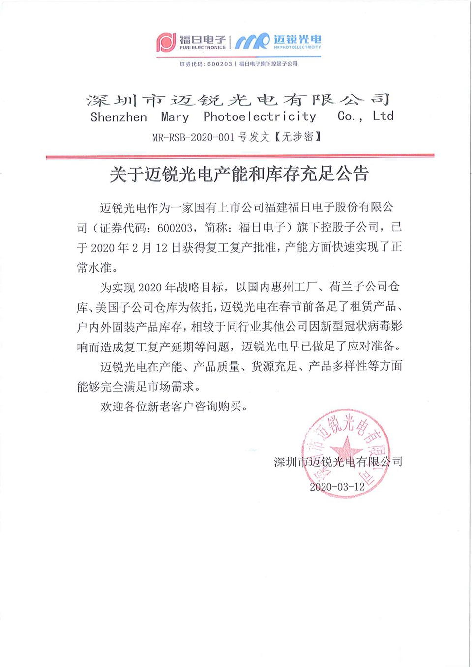 星空电竞光电产能和库存充足公告